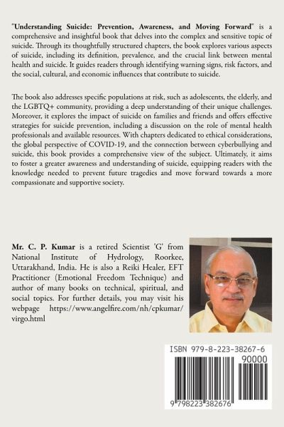"Understanding Suicide: Prevention, Awareness, and Moving Forward" is a comprehensive and insightful book that delves into the complex and sensitive topic of suicide. Through its thoughtfully structured chapters, the book explores various aspects of suicide, including its definition, prevalence, and the crucial link between mental health and suicide. It guides readers through identifying warning signs, risk factors, and the social, cultural, and economic influences that contribute to suicide. The book also addresses specific populations at risk, such as adolescents, the elderly, and the LGBTQ+ community, providing a deep understanding of their unique challenges. Moreover, it explores the impact of suicide on families and friends and offers effective strategies for suicide prevention, including a discussion on the role of mental health professionals and available resources. With chapters dedicated to ethical considerations, the global perspective of COVID-19, and the connection between cyberbullying and suicide, this book provides a comprehensive view of the subject. Ultimately, it aims to foster a greater awareness and understanding of suicide, equipping readers with the knowledge needed to prevent future tragedies and move forward towards a more compassionate and supportive society.