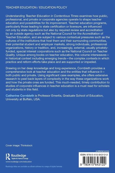 Understanding Teacher Education in Contentious Times examines how public, professional, and private or corporate agencies operate to shape teacher education and possibilities for its improvement. Teacher education programs,¿ particularly those leading to state certification or licensure, are influenced not only by state regulations but also by required review and accreditation by an outside agency such as the National Council for the Accreditation of Teacher Education, and are subject to various contextual pressures such as the cultures of the institutions that host them and their surrounding communities, their potential student and employer markets, strong individuals, professional organizations, history or tradition, and, increasingly, external, usually privately-funded, special interest corporations such as the National Council on Teacher Quality.¿ Unique among books on teacher education, this volume interweaves-in historical context including emerging trends-the complex contexts in which practice and reform efforts take place and are supported or impeded. ¿