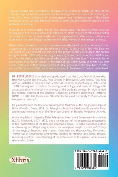 This writing has been dictated by observation of human personalities. Most of the other writings I have read seem to placate some genders us means of pandering for sales. Also, knowing that certain human gender must be treated gently, the advice offered by earlier writings has been devoid of practical application or solution to the problem for success. What works is more important than ideal proposition. Adolescent amore must be distinguished from the matured adult relationships. While both are affected and afflicted by biochemical mix, the later situation is more organized and better understood because experience has been brought to bear on the effectiveness of the cerebral process. Relationship between a man and a woman is mostly based on informed selection or acceptance by the female gender who determines the dynamics of the mix. Then we can count on luck to meet our matches and prayer on the continuity of the sparks brought into the relationship, as long as equality forms the basis of the initial desire with no sides designing to take undue advantage of the other side. There would be no suppression or denial of freedom in the name of love either overtly or covertly. As long as the expression of that freedom does not inflict physical or chemical harm to either party in the pursuant of the heart's desire, love would be allowed to flourish unhindered.