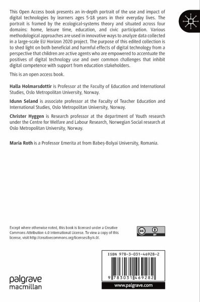 This Open Access book presents an in-depth portrait of the use and impact of digital technologies by learners ages 5-18 years in their everyday lives. The portrait is framed by the ecological-systems theory and situated across four domains: home, leisure time, education, and civic participation. Various methodological approaches are used in innovative ways to analyze data collected in a large-scale EU Horizon 2020 project. The purpose of this edited collection is to shed light on both beneficial and harmful effects of digital technology from a perspective that children are active agents who are empowered to accentuate the positives of digital technology use and over common challenges that inhibit digital competence with support from education stakeholders. This is an open access book.