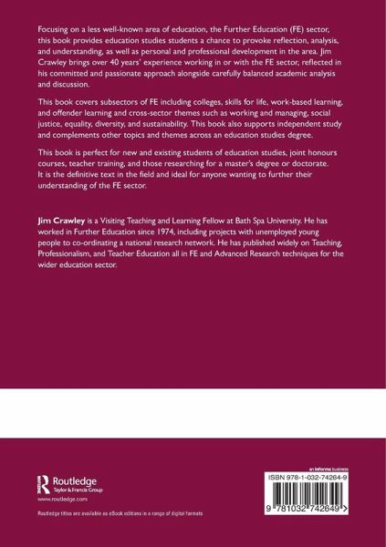 Focusing on a less well-known area of education, the Further Education (FE) sector, this book provides education studies students a chance to provoke reflection, analysis, and understanding, as well as personal and professional development in the area. Jim Crawley brings over 40 years' experience working in or with the FE sector, reflected in his committed and passionate approach alongside carefully balanced academic analysis and discussion.