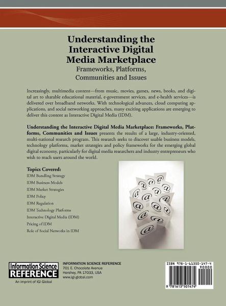 Increasingly, multimedia content-from music, movies, games, news, books, and digital art to sharable educational material, e-government services, and e-health services-is delivered over broadband networks. With technological advances, cloud computing applications, and social networking approaches, many exciting applications are emerging to deliver this content as Interactive Digital Media (IDM). Understanding the Interactive Digital Media Marketplace: Frameworks, Platforms, Communities and Issues presents the results of a large, industry-oriented, multi-national research program. This research seeks to discover usable business models, technology platforms, market strategies and policy frameworks for the emerging global digital economy, particularly for digital media researchers and industry entrepreneurs who wish to reach users around the world.