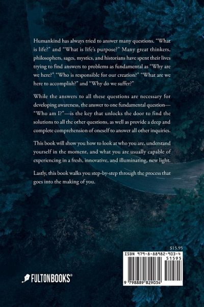 Humankind has always tried to answer many questions. "What is life?" and "What is life's purpose?" Many great thinkers, philosophers, sages, mystics, and historians have spent their lives trying to find answers to problems as fundamental as "Why are we here?" "Who is responsible for our creation?" "What are we here to accomplish?" and "Why do we suffer?" While the answers to all these questions are necessary for developing awareness, the answer to one fundamental question--"Who am I?"--is the key that unlocks the door to find the solutions to all the other questions, as well as provide a deep and complete comprehension of oneself to answer all other inquiries. This book will show you how to look at who you are, understand yourself in the moment, and what you are usually capable of experiencing in a fresh, innovative, and illuminating, new light. Lastly, this book walks you step-by-step through the process that goes into the making of you.