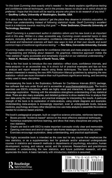 This is the first book to introduce the new statistics - effect sizes, confidence intervals, and meta-analysis - in an accessible way. It is chock full of practical examples and tips on how to analyze and report research results using these techniques. The book is invaluable to readers interested in meeting the new APA Publication Manual guidelines by adopting the new statistics - which are more informative than null hypothesis significance testing, and becoming widely used in many disciplines. Accompanying the book is the Exploratory Software for Confidence Intervals (ESCI) package, free software that runs under Excel and is accessible at www.thenewstatistics.com. The book's exercises use ESCI's simulations, which are highly visual and interactive, to engage users and encourage exploration. Working with the simulations strengthens understanding of key statistical ideas. There are also many examples, and detailed guidance to show readers how to analyze their own data using the new statistics, and practical strategies for interpreting the results. A particular strength of the book is its explanation of meta-analysis, using simple diagrams and examples. Understanding meta-analysis is increasingly important, even at undergraduate levels, because medicine, psychology and many other disciplines now use meta-analysis to assemble the evidence needed for evidence-based practice. The book's pedagogical program, built on cognitive science principles, reinforces learning: Boxes provide "evidence-based" advice on the most effective statistical techniques. Numerous examples reinforce learning, and show that many disciplines are using the new statistics. Graphs are tied in with ESCI to make important concepts vividly clear and memorable. Opening overviews and end of chapter take-home messages summarize key points. Exercises encourage exploration, deep understanding, and practical applications. This highly accessible book is intended as the core text for any course that emphasizes the new statistics, or as a supplementary text for graduate and/or advanced undergraduate courses in statistics and research methods in departments of psychology, education, human development , nursing, and natural, social, and life sciences. Researchers and practitioners interested in understanding the new statistics, and future published research, will also appreciate this book. A basic familiarity with introductory statistics is assumed.