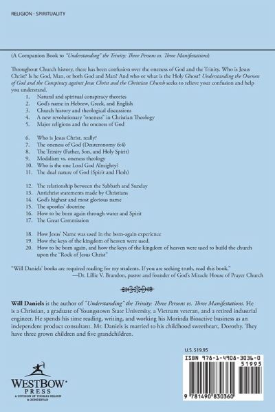 (A Companion Book to "Understanding" the Trinity: Three Persons vs. Three Manifestations) Throughout Church history, there has been confusion over the oneness of God and the Trinity. Who is Jesus Christ? Is he God, Man, or both God and Man? And who or what is the Holy Ghost? Understanding the Oneness of God and the Conspiracy against Jesus Christ and the Christian Church seeks to relieve your confusion and help you understand. Natural and spiritual conspiracy theories God's name in Hebrew, Greek, and English Church history and theological discussions A new revolutionary "oneness" in Christian Theology Major religions and the oneness of God Who is Jesus Christ, really? The oneness of God (Deuteronomy 6:4) The Trinity (Father, Son, and Holy Spirit) Modalism vs. oneness theology Who is the one Lord God Almighty? The dual nature of God (Spirit and Flesh) The relationship between the Sabbath and Sunday Antichrist statements made by Christians God's highest and most glorious name The apostles' doctrine How to be born again through water and Spirit The Great Commission How Jesus' Name was used in the born-again experience How the keys of the kingdom of heaven were used. How to be born again, and how the keys of the kingdom of heaven were used to build the church upon the "Rock of Jesus Christ" "Will Daniels' books are required reading for my students. If you are seeking truth, read this book." -Dr. Lillie V. Brandon, pastor and founder of God's Miracle House of Prayer Church