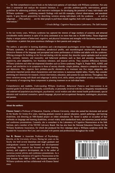 Comprehensive and readable, Understanding Williams Syndrome: Behavioral Patterns and Interventions is an essential guide for all those professionally, scientifically, or personally involved with this so frequently misunderstood and underserved population--psychologists, psychiatrists, social workers, and other mental health professionals; special educators and vocational counselors; speech-language, physical, and occupational therapists; audiologists; physicians; and parents.