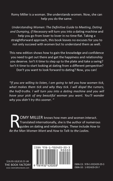 Romy Miller is a woman. She understands women. Now, she can help you do the same. Understanding Women: The Definitive Guide to Meeting, Dating and Dumping, if Necessary will turn you into a dating machine and help you go from loser to lover in no time flat. Taking a straightforward approach, this book leaves no excuses for you to not only succeed with women but to understand them as well. This new edition shows how to gain the knowledge and confidence you need to get out there and get the happiness and relationship you deserve. Isn't it time to step up to the plate and take a swing? Isn't it time to start looking at dating from a different perspective? Don't you want to look forward to dating? Now, you can!