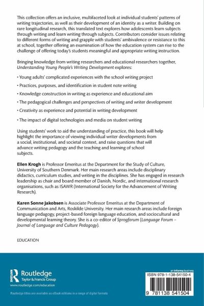 Introduction 1. Writing and writer development: A theoretical framework for longitudinal study 2. Extended formats: Students' development as knowledge constructing writers 3. Practices, purposes, and identifications in student note writing 4. Enabling and constraining: Digital technology in students' writing and writer development 5. Young adults' complicated experiences with the school writing project 6. Narratives as practice and potentials in adolescents' writer development 7. Identity work and writing development in mathematics 8. Creativity as experience and potential in writing development 9. Writing and writer development: Pedagogical challenges and perspectives