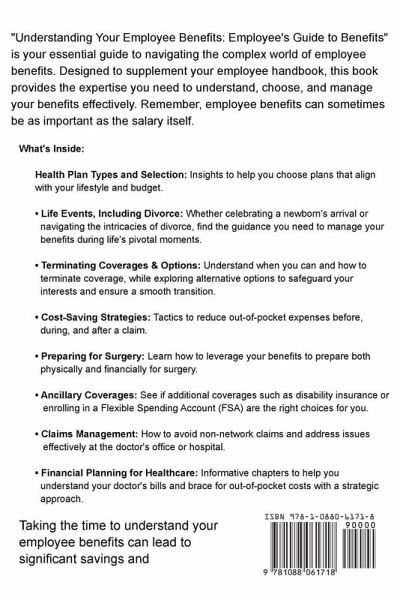 "Understanding Your Employee Benefits: Employee's Guide to Benefits" is your essential guide to navigating the complex world of employee benefits. Designed to supplement your employee handbook, this book provides the expertise you need to understand, choose, and manage your benefits effectively. Remember, employee benefits can sometimes be as important as the salary itself. What's Inside: Health Plan Types and Selection: Insights to help you choose plans that align with your lifestyle and budget. Life Events, Including Divorce: Whether celebrating a newborn's arrival or navigating the intricacies of divorce, find the guidance you need to manage your benefits during life's pivotal moments. Terminating Coverages & Options: Understand when you can and how to terminate coverage, while exploring alternative options to safeguard your interests and ensure a smooth transition. Cost-Saving Strategies: Tactics to reduce out-of-pocket expenses before, during, and after a claim. Preparing for Surgery: Learn how to leverage your benefits to prepare both physically and financially for surgery. Ancillary Coverages: See if additional coverages such as disability insurance or enrolling in a Flexible Spending Account (FSA) are the right choices for you. Claims Management: How to avoid non-network claims and address issues effectively at the doctor's office or hospital. Financial Planning for Healthcare: Informative chapters to help you understand your doctor's bills and brace for out-of-pocket costs with a strategic approach. Taking the time to understand your employee benefits can lead to significant savings and invaluable peace of mind.