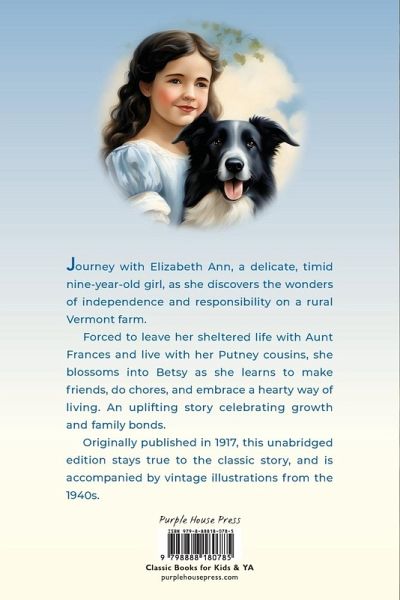 Journey with Elizabeth Ann, a delicate, timid 9-year-old girl, as she discovers the wonders of independence and responsibility on a rural Vermont farm. Forced to leave her sheltered life with Aunt Frances and live with her Putney cousins, she blossoms into Betsy as she learns to make friends, do chores, and embrace a hearty way of living. An uplifting story celebrating growth and family bonds. Originally published in 1917 and loved by generations, this unabridged edition stays true to the classic story, and is accompanied by vintage illustrations from the 1940s.