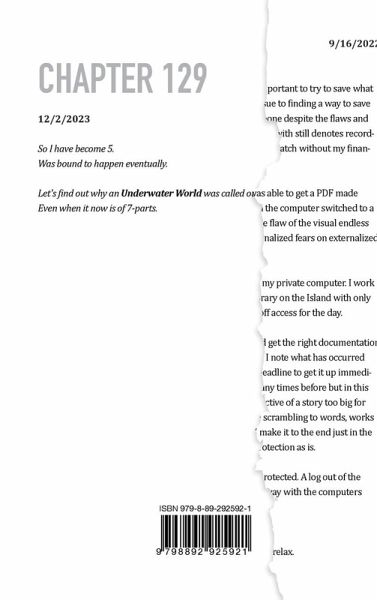 In predictive sub-text, the conclusion of what is considered "The Lion's Mane Jellyfish" collectively is now available of the Book Series Comprised of "SOS - Sense of Space", "Odyscinal Purposes", "After Jellyfish", "a spinster's story" and "Underwater World 3-5 - A Land of Far Away Government Assistance" (This Book is United States Copyright Protected) In Underwater World, it is epic conclusion comprised of a 7-part novel batting over 3000 pages of world building, world fixing and autobiographical stories spanning from 2022-2023. Mystery, Sociology and Technology combine as a real life everyday story comes together from the silence of secrets brave and new. What is in store for the everyday person here of would be a fight and foundation for The American Dream in a realm of reality. In escapism, building of individuality and original intellectual property in a world of someone dubbed, "a man of 1000 dollars". Where does fate lead while things govern over heads and under the radar. Perhaps it is a capture of the imaginary world of fractured mirrors glued together of determining what is your identifiable archetype? A Life's Work completed to a conclusion of an entire saga series released concurrently in a never before done method while years of copyright infringement on I and attacks towards my reclamation of copyright protected works backed in protection from 95 years after my death legally in the small field of licensed rights or originality against the backdrop of world literature towards discussion of everyday secrets.