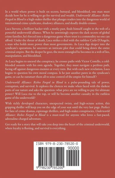 In a world where power is built on secrets, betrayal, and bloodshed, one man must decide how far he is willing to go for survival and wealth. Underworld Alliance: Riches Forged in Blood is a high-stakes thriller that plunges readers into the dangerous world of international crime syndicates, shadowy alliances, and deadly double-crosses. Luca Stevens, a brilliant hacker with a murky past, finds himself caught in the web of a powerful underworld alliance. When he unwittingly exposes the dark secrets of global crime families, he's forced into a dangerous game where trust is a commodity no one can afford. Under the threat of death, Luca strikes a deal with the ruthless Carlo D'Angelo, a man who holds more power than most governments. As Luca digs deeper into the syndicate's operations, he uncovers an intricate plot that could bring down the entire criminal empire. But the deeper he goes, the more entangled he becomes in a web of lies, manipulation, and bloodshed. As Luca begins to unravel the conspiracy, he crosses paths with Victor Costello, a cold-blooded assassin with his own agenda. Together, they must navigate a perilous path, facing off against dangerous enemies at every turn. But with each new revelation, Luca begins to question his own moral compass. Is he just another pawn in the syndicate's game, or can he outsmart them all to seize control of the empire for himself? Underworld Alliance: Riches Forged in Blood is a pulse-pounding tale of power, corruption, and survival. It explores the choices we make when faced with the darkest parts of our nature and asks the question: what price are we willing to pay for ultimate power? Will Luca rise to the top, or will he become another casualty in the ruthless game of the underworld? With richly developed characters, unexpected twists, and high-octane action, this gripping thriller will keep you on the edge of your seat until the very last page. Perfect for fans of crime dramas, espionage thrillers, and high-stakes conspiracies, Underworld Alliance: Riches Forged in Blood is a must-read for anyone who loves a fast-paced, adrenaline-charged adventure. Get ready for a story that will take you deep into the heart of the criminal underworld, where loyalty is fleeting, and survival is everything.