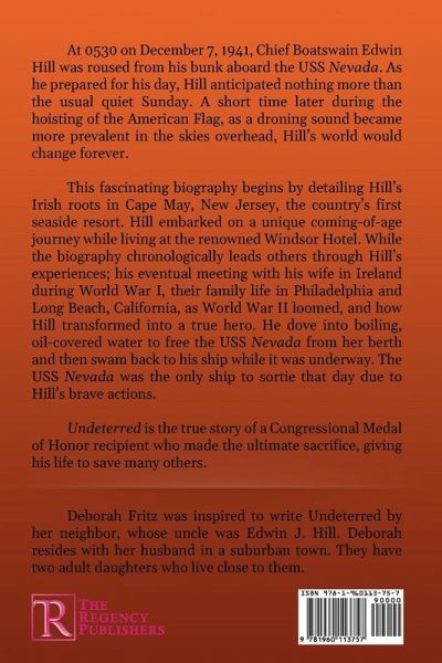 At 0530 on December 7, 1941, Chief Boatswain Edwin Hill was roused from his bunk aboard the USS Nevada. As he prepared for his day, Hill anticipated nothing more than the usual quiet Sunday. A short time later during the hoisting of the American Flag, as a droning sound became more prevalent in the skies overhead, Hill's world would change forever. This fascinating biography begins by detailing Hill's Irish roots in Cape May, New Jersey, the country's first seaside resort. Hill embarked on a unique coming-of-age journey while living at the renowned Windsor Hotel. While the biography chronologically leads others through Hill's experiences; his eventual meeting with his wife in Ireland during World War I, their family life in Philadelphia and Long Beach, California, as World War II loomed, and how Hill transformed into a true hero. He dove into boiling, oil-covered water to free the USS Nevada from her berth and then swam back to his ship while it was underway. The USS Nevada was the only ship to sortie that day due to Hill's brave actions. Undeterred is the true story of a Congressional Medal of Honor recipient who made the ultimate sacrifice, giving his life to save many others.