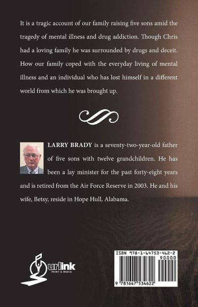 It is a tragic account of our family raising five sons amid the tragedy of mental illness and drug addiction. Though Chris had a loving family he was surrounded by drugs and deceit. How our family coped with the everyday living of mental illness and an individual who has lost himself in a different world from which he was brought up. LARRY BRADY is a seventy-two-year-old father of five sons with twelve grandchildren. He has been a lay minister for the past forty-eight years and is retired from the Air Force Reserve in 2003. He and his wife, Betsy, reside in Hope Hull, Alabama.
