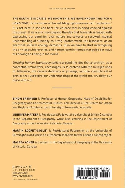 Preface: An Anarchist Political Ecology, John P. Clark Introduction: The Political Ecology of Human Supremacy, Simon Springer, Jennifer Mateer, and Martin Locret-Collet Chapter 1. Animals in Anarchist Political Ecology, Friederike Schmitz Chapter 2. Political Ecology and Animal Liberation, Patrik Gazo Chapter 3. Anarchism, Feminism and Veganism: A Convergence of Struggles, Ophélie Véron and Richard J. White Chapter 4. Vegan Capitalism and Animal Sanctuaries on Stolen Land: Re-imagining Animal Liberation as an Anti-Colonial Praxis, Anonymous Chapter 5. Whose Environment? Epistemic-Political Disputes over a Concept and its Uses, Marcelo Lopes de Souza Chapter 6. A Future Eco-Anarchic Society and the Means to Achieving It, Shane McDonnell Chapter 7. Beyond the Anthropocene, Toward the Anarchocene? Notes on the Emergence of the Next Epoch, Randall Amster Chapter 8. Chtuluccene Compacts: An Anarchist Guide to Multispecies Troublemaking, Benjamin O'Heran Chapter 9. "Street Dogs" of Istanbul: An Exemplary