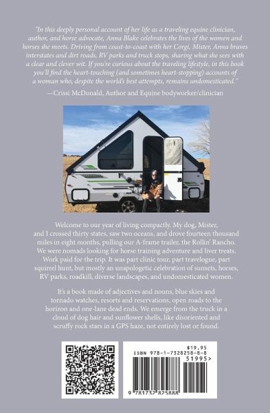 Welcome to our year of living compactly. My dog, Mister, and I took to the road pulling our A-frame trailer, the Rollin' Rancho. I'm a traveling horse trainer/clinician, who became a non-essential worker during the COVID-19 lockdown. Then, in 2022, we bounced back. We were nomads looking for horse training adventure and liver treats. Work paid for the trip; it was part clinic tour, part travelogue, part squirrel hunt. But mostly an unapologetic celebration of sunsets, horses, RV parks, roadkill, diverse landscapes, and undomesticated women. It's a book made of made of adjectives and nouns, blue skies and tornado watches, resorts and reservations, open roads to the horizon, and one-lane dead-ends. We emerge from the truck in a cloud of dog hair and sunflower shells, like disoriented and scruffy rock stars in a GPS haze, not entirely lost or found. This book isn't about training, although there are horses in it. It's a follow-up of Stable Relation, my first book, but my life changed in ways I would never have guessed, so don't expect the usual sequel. Undomesticated Women is a travel memoir, a peek behind the curtains of what my job is like. I wanted to see this beautiful country, do some time travel, and explore thoughts and memories now that I've become a gray mare. Mister would tell you it's his memoir about being tasked with the unreasonable job of guarding me against a wild range of dangers. Like eating dinner late. He's a dog unimpressed with my tiny fame.