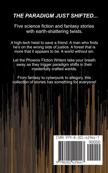 Five science fiction and fantasy stories with earth-shattering twists. A high-tech heist to save a friend. A man who finds he's on the wrong side of justice. A forest that is more than it appears to be. A world without sin. Let the Phoenix Fiction Writers take your breath away as they trigger paradigm shifts in their masterfully crafted imaginary worlds. From fantasy, to cyberpunk, to dystopian, to allegory, this collection of stories has something for everyone! The Phoenix Fiction Writers are a collective of independent authors who write science fiction and fantasy. To them, the phoenix represents the transformative power of story.