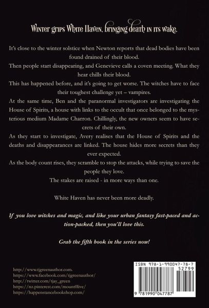 Winter grips White Haven, bringing death in its wake. It's close to the winter solstice when Newton reports that dead bodies have been found drained of their blood. Then people start disappearing, and Genevieve calls a coven meeting. What they hear chills their blood. This has happened before, and it's going to get worse. The witches have to face their toughest challenge yet - vampires. At the same time, Ben and the paranormal investigators are investigating the House of Spirits, a house with links to the occult that once belonged to the mysterious medium Madame Charron. Chillingly, the new owners seem to have secrets of their own. As they start to investigate, Avery realises that the House of Spirits and the deaths and disappearances are linked. The house hides more secrets than they ever expected. As the body count rises, they scramble to stop the attacks, while trying to save the people they love. The stakes are raised - in more ways than one. White Haven has never been more deadly. If you love witches and magic, and like your urban fantasy fast-paced and action-packed, then you'll love this. Grab the fifth book in the series now!