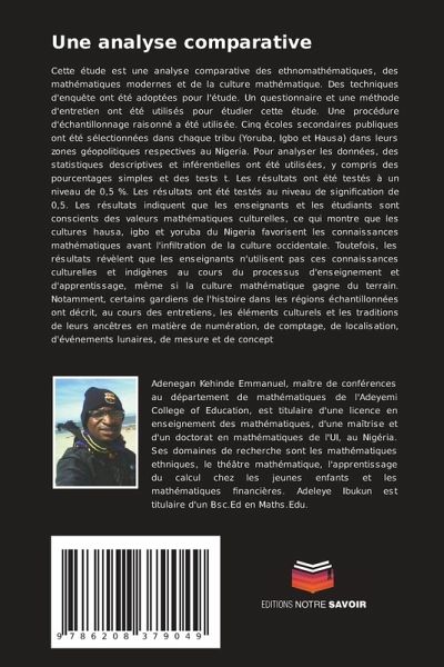 Cette étude est une analyse comparative des ethnomathématiques, des mathématiques modernes et de la culture mathématique. Des techniques d'enquête ont été adoptées pour l'étude. Un questionnaire et une méthode d'entretien ont été utilisés pour étudier cette étude. Une procédure d'échantillonnage raisonné a été utilisée. Cinq écoles secondaires publiques ont été sélectionnées dans chaque tribu (Yoruba, Igbo et Hausa) dans leurs zones géopolitiques respectives au Nigeria. Pour analyser les données, des statistiques descriptives et inférentielles ont été utilisées, y compris des pourcentages simples et des tests t. Les résultats ont été testés à un niveau de 0,5 %. Les résultats ont été testés au niveau de signification de 0,5. Les résultats indiquent que les enseignants et les étudiants sont conscients des valeurs mathématiques culturelles, ce qui montre que les cultures hausa, igbo et yoruba du Nigeria favorisent les connaissances mathématiques avant l'infiltration de la culture occidentale. Toutefois, les résultats révèlent que les enseignants n'utilisent pas ces connaissances culturelles et indigènes au cours du processus d'enseignement et d'apprentissage, même si la culture mathématique gagne du terrain. Notamment, certains gardiens de l'histoire dans les régions échantillonnées ont décrit, au cours des entretiens, les éléments culturels et les traditions de leurs ancêtres en matière de numération, de comptage, de localisation, d'événements lunaires, de mesure et de concept
