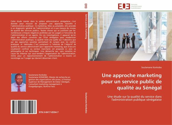 Cette étude menée dans la sphère administrative sénégalaise s'est donnée pour mission de proposer une approche nouvelle à l'administration publique : le marketing. Mais au préalable, elle procède à un diagnostic général de l'administration et à une mesure du niveau de qualité des services publics. Toutes choses qui se justifient par les nombreuses critiques négatives proférées par les usagers à l'encontre de l'administration et ses agents. De ces investigations, il apparait qu'en dépit des efforts consentis par l'Etat sénégalais pour moderniser l'administration publique, la qualité reste une quête qui n'aboutira que par des approches savantes permettant de rompre avec les vieilles pratiques et habitudes. C'est justement à l'atteinte de l'objectif de qualité du service administratif que l'approche marketing, que d'aucuns voudraient confiner au secteur marchand, est proposée ici avec sa philosophie et ses techniques. Une démarche qui, sans remettre en cause les théories qui sous-tendent l'organisation de l'administration, milite pour un repositionnement de l'administration à travers un recentrage sur l'usager qui devient désormais client.