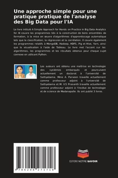 Le livre intitulé A Simple Approach for Hands on Practice in Big Data Analytics for AI couvre les programmes liés à la construction de bons ensembles de formation, à la mise en oeuvre d'algorithmes d'apprentissage automatique tels que la classification, la régression et la corrélation. Il couvre également les programmes relatifs à MongoDB, Hadoop, HDFS, Pig et Hive, Yarn, ainsi que la visualisation à l'aide de Tableau. Le livre met l'accent sur les algorithmes, les programmes et les résultats obtenus pour chaque sujet connexe en utilisant Python.