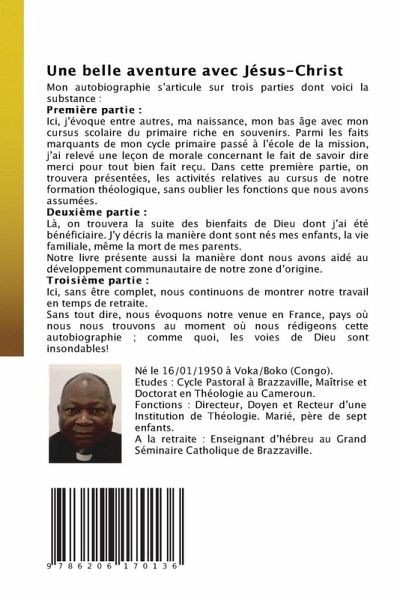 Mon autobiographie s'articule sur trois parties dont voici la substance :Première partie :Ici, j'évoque entre autres, ma naissance, mon bas âge avec mon cursus scolaire du primaire riche en souvenirs. Parmi les faits marquants de mon cycle primaire passé à l'école de la mission, j'ai relevé une leçon de morale concernant le fait de savoir dire merci pour tout bien fait reçu. Dans cette première partie, on trouvera présentées, les activités relatives au cursus de notre formation théologique, sans oublier les fonctions que nous avons assumées.Deuxième partie :Là, on trouvera la suite des bienfaits de Dieu dont j'ai été bénéficiaire. J'y décris la manière dont sont nés mes enfants, la vie familiale, même la mort de mes parents.Notre livre présente aussi la manière dont nous avons aidé au développement communautaire de notre zone d'origine.Troisième partie :Ici, sans être complet, nous continuons de montrer notre travail en temps de retraite.Sans tout dire, nous évoquons notre venue en France, pays où nous nous trouvons au moment où nous rédigeons cette autobiographie ; comme quoi, les voies de Dieu sont insondables!