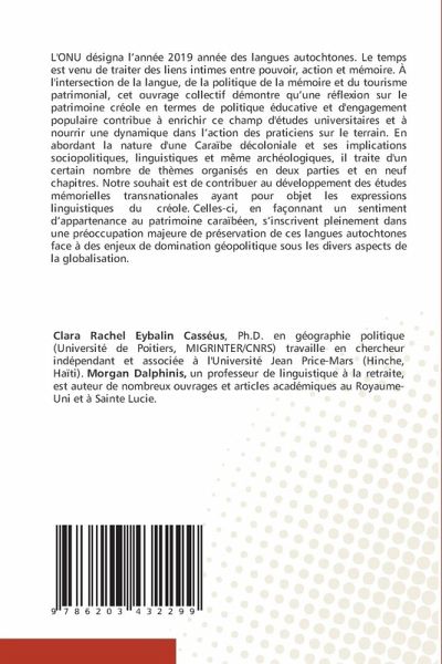 L'ONU désigna l'année 2019 année des langues autochtones. Le temps est venu de traiter des liens intimes entre pouvoir, action et mémoire. À l'intersection de la langue, de la politique de la mémoire et du tourisme patrimonial, cet ouvrage collectif démontre qu'une réflexion sur le patrimoine créole en termes de politique éducative et d'engagement populaire contribue à enrichir ce champ d'études universitaires et à nourrir une dynamique dans l'action des praticiens sur le terrain. En abordant la nature d'une Caraïbe décoloniale et ses implications sociopolitiques, linguistiques et même archéologiques, il traite d'un certain nombre de thèmes organisés en deux parties et en neuf chapitres. Notre souhait est de contribuer au développement des études mémorielles transnationales ayant pour objet les expressions linguistiques du créole. Celles-ci, en façonnant un sentiment d'appartenance au patrimoine caraïbéen, s'inscrivent pleinement dans une préoccupation majeure de préservation de ces langues autochtones face à des enjeux de domination géopolitique sous les divers aspects de la globalisation.