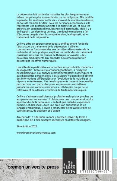 La dépression fait partie des maladies les plus fréquentes et en même temps les plus sous-estimées de notre époque. Elle modifie la pensée, les sentiments et la vie - souvent de manière insidieuse, parfois de manière brutale. Pour les personnes concernées, elle représente une profonde atteinte à la qualité de vie, et pour les proches, un sentiment d'impuissance et d'inquiétude. Mais il y a de l'espoir : ces dernières années, la médecine moderne a fait d'énormes progrès dans la compréhension, le diagnostic et le traitement de la dépression. Ce livre offre un aperçu complet et scientifiquement fondé de l'état actuel du traitement de la dépression. Il allie les connaissances fondamentales aux dernières découvertes de la recherche et de la pratique, explique les méthodes de traitement classiques ainsi que les formes de thérapie innovantes - des nouveaux médicaments aux procédés neuromodulateurs en passant par les offres numériques. Une attention particulière est accordée aux possibilités modernes de diagnostic : Grâce aux marqueurs génétiques, à l'imagerie neurobiologique, aux analyses comportementales numériques et aux diagnostics personnalisés, il est aujourd'hui possible d'obtenir des informations différenciées sur l'évolution de la maladie et la réponse au traitement. Ces développements ouvrent de nouvelles perspectives - en particulier pour les personnes considérées jusqu'à présent comme résistantes aux thérapies ou qui ne se retrouvaient pas dans les systèmes de traitement classiques. Ce livre s'adresse aussi bien aux professionnels qu'aux proches ou aux personnes concernées. Il plaide pour une compréhension plus approfondie de la dépression - en tant que maladie, expérience humaine et défi social. Avec une précision scientifique et un langage empathique, il invite à emprunter de nouvelles voies de connaissance, de guérison et d'espoir. Au cours des 11 dernières années, Bremen University Press a publié plus de 4 700 ouvrages spécialisés en différentes langues.