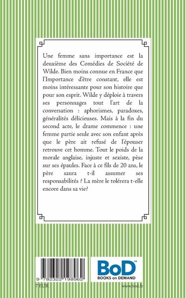 Une femme sans importance est la deuxième des Comédies de Société de Wilde. Bien moins connue en France que l'Importance d'être constant, elle est moins intéressante pour son histoire que pour son esprit. Wilde y déploie à travers ses personnages tout l'art de la conversation : aphorismes, paradoxes, généralités délicieuses. Mais à la fin du second acte, le drame commence : une femme partie seule avec son enfant après que le père ait refusé de l'épouser retrouve cet homme. Tout le poids de la morale anglaise, injuste et sexiste, pèse sur ses épaules. Face à ce fils de 20 ans, le père saura t-il assumer ses responsabilités ? La mère le tolérera t-elle encore dans sa vie?