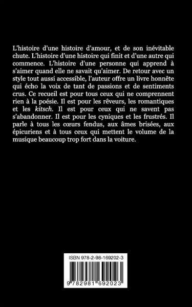 L'histoire d'une histoire d'amour, et de son inévitable chute. L'histoire d'une histoire qui finit et d'une autre qui commence. L'histoire d'une personne qui apprend à s'aimer quand elle ne savait qu'aimer. De retour avec un style tout aussi accessible, l'auteur offre un livre honnête qui écho la voix de tant de passions et de sentiments crus. Ce recueil est pour tous ceux qui ne comprennent rien à la poésie. Il est pour les rêveurs, les romantiques et les kitsch. Il est pour ceux qui ne savent pas s'abandonner. Il est pour les cyniques et les frustrés. Il parle à tous les c¿urs fendus, aux âmes brisées, aux épicuriens et à tous ceux qui mettent le volume de la musique beaucoup trop fort dans la voiture.