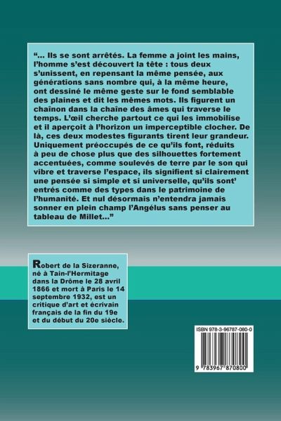 "... Ils se sont arrêtés. La femme a joint les mains, l'homme s'est découvert la tête : tous deux s'unissent, en repensant la même pensée, aux générations sans nombre qui, à la même heure, ont dessiné le même geste sur le fond semblable des plaines et dit les mêmes mots. Ils figurent un chaînon dans la chaîne des âmes qui traverse le temps. L'œil cherche partout ce qui les immobilise et il aperçoit à l'horizon un imperceptible clocher. De là, ces deux modestes figurants tirent leur grandeur. Uniquement préoccupés de ce qu'ils font, réduits à peu de chose plus que des silhouettes fortement accentuées, comme soulevés de terre par le son qui vibre et traverse l'espace, ils signifient si clairement une pensée si simple et si universelle, qu'ils sont' entrés comme des types dans le patrimoine de l'humanité. Et nul désormais n'entendra jamais sonner en plein champ l'Angélus sans penser au tableau de Millet..."