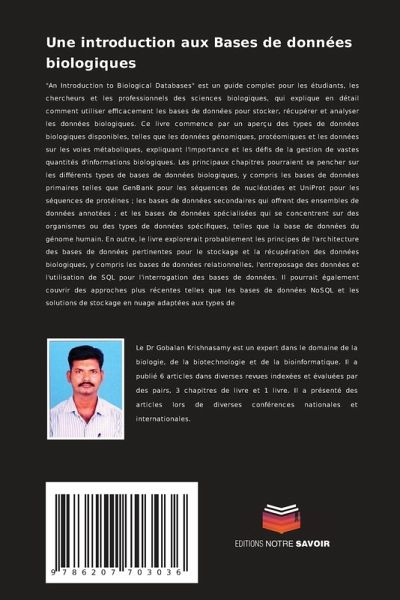 "An Introduction to Biological Databases" est un guide complet pour les étudiants, les chercheurs et les professionnels des sciences biologiques, qui explique en détail comment utiliser efficacement les bases de données pour stocker, récupérer et analyser les données biologiques. Ce livre commence par un aperçu des types de données biologiques disponibles, telles que les données génomiques, protéomiques et les données sur les voies métaboliques, expliquant l'importance et les défis de la gestion de vastes quantités d'informations biologiques. Les principaux chapitres pourraient se pencher sur les différents types de bases de données biologiques, y compris les bases de données primaires telles que GenBank pour les séquences de nucléotides et UniProt pour les séquences de protéines ; les bases de données secondaires qui offrent des ensembles de données annotées ; et les bases de données spécialisées qui se concentrent sur des organismes ou des types de données spécifiques, telles que la base de données du génome humain. En outre, le livre explorerait probablement les principes de l'architecture des bases de données pertinentes pour le stockage et la récupération des données biologiques, y compris les bases de données relationnelles, l'entreposage des données et l'utilisation de SQL pour l'interrogation des bases de données. Il pourrait également couvrir des approches plus récentes telles que les bases de données NoSQL et les solutions de stockage en nuage adaptées aux types de