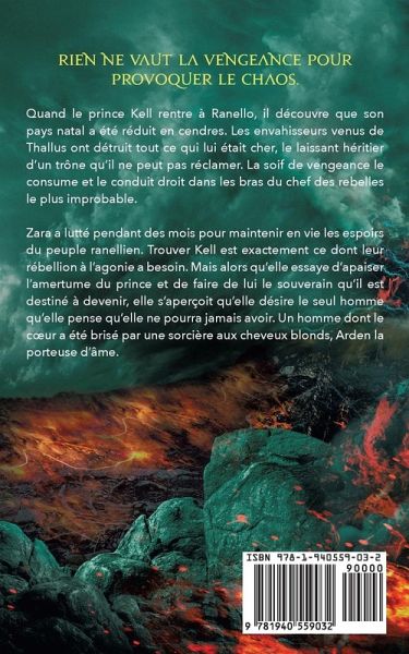 Rien ne vaut la vengeance pour provoquer le chaos... Quand le prince Kell rentre à Ranello, il découvre que son pays natal a été réduit en cendres. Les envahisseurs venus de Thallus ont détruit tout ce qui lui était cher, le laissant héritier d’un trône qu’il ne peut pas réclamer. La soif de vengeance le consume et le conduit droit dans les bras du chef des rebelles le plus improbable. Zara a lutté pendant des mois pour maintenir en vie les espoirs du peuple ranellien. Trouver Kell est exactement ce dont leur rébellion à l’agonie a besoin. Mais alors qu’elle essaye d’apaiser l’amertume du prince et de faire de lui le souverain qu’il est destiné à devenir, elle s’aperçoit qu’elle désire le seul homme qu’elle pense qu’elle ne pourra jamais avoir. Un homme dont le cœur a été brisé par une sorcière aux cheveux blonds, Arden la porteuse d’âme.