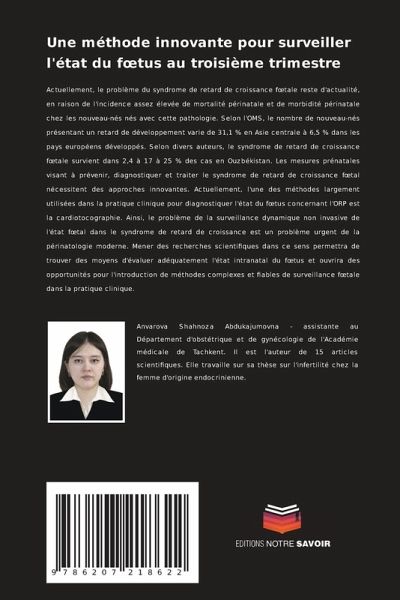 Actuellement, le problème du syndrome de retard de croissance foetale reste d'actualité, en raison de l'incidence assez élevée de mortalité périnatale et de morbidité périnatale chez les nouveau-nés nés avec cette pathologie. Selon l'OMS, le nombre de nouveau-nés présentant un retard de développement varie de 31,1 % en Asie centrale à 6,5 % dans les pays européens développés. Selon divers auteurs, le syndrome de retard de croissance foetale survient dans 2,4 à 17 à 25 % des cas en Ouzbékistan. Les mesures prénatales visant à prévenir, diagnostiquer et traiter le syndrome de retard de croissance foetal nécessitent des approches innovantes. Actuellement, l'une des méthodes largement utilisées dans la pratique clinique pour diagnostiquer l'état du foetus concernant l'ORP est la cardiotocographie. Ainsi, le problème de la surveillance dynamique non invasive de l'état foetal dans le syndrome de retard de croissance est un problème urgent de la périnatologie moderne. Mener des recherches scientifiques dans ce sens permettra de trouver des moyens d'évaluer adéquatement l'état intranatal du foetus et ouvrira des opportunités pour l'introduction de méthodes complexes et fiables de surveillance foetale dans la pratique clinique.