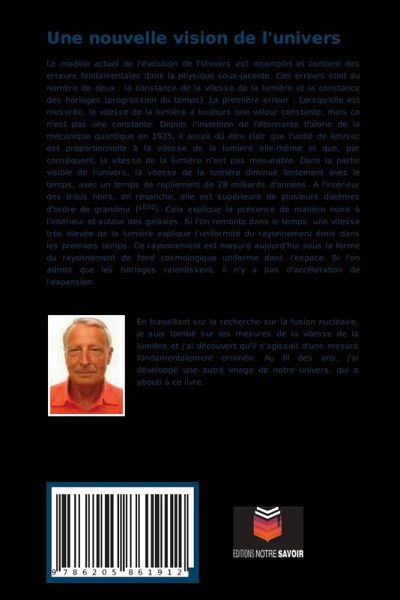 Le modèle actuel de l'évolution de l'Univers est incomplet et contient des erreurs fondamentales dans la physique sous-jacente. Ces erreurs sont au nombre de deux : la constance de la vitesse de la lumière et la constance des horloges (progression du temps). La première erreur : Lorsqu'elle est mesurée, la vitesse de la lumière a toujours une valeur constante, mais ce n'est pas une constante. Depuis l'invention de l'étonnante théorie de la mécanique quantique en 1925, il aurait dû être clair que l'unité de km/sec est proportionnelle à la vitesse de la lumière elle-même et que, par conséquent, la vitesse de la lumière n'est pas mesurable. Dans la partie visible de l'univers, la vitesse de la lumière diminue lentement avec le temps, avec un temps de repliement de 28 milliards d'années. À l'intérieur des trous noirs, en revanche, elle est supérieure de plusieurs dixièmes d'ordre de grandeur (1030). Cela explique la présence de matière noire à l'intérieur et autour des galaxies. Si l'on remonte dans le temps, une vitesse très élevée de la lumière explique l'uniformité du rayonnement émis dans les premiers temps. Ce rayonnement est mesuré aujourd'hui sous la forme du rayonnement de fond cosmologique uniforme dans l'espace. Si l'on admet que les horloges ralentissent, il n'y a pas d'accélération de l'expansion.