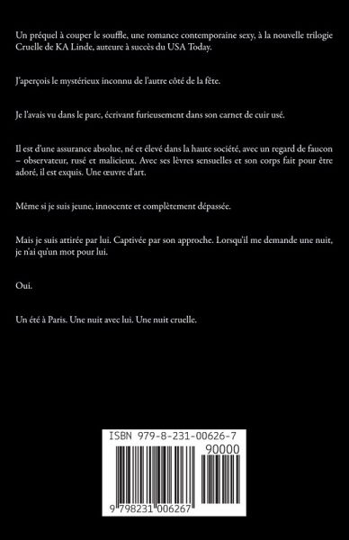 Un préquel à couper le souffle, une romance contemporaine sexy, à la nouvelle trilogie Cruelle de KA Linde, auteure à succès du USA Today. J'aperçois le mystérieux inconnu de l'autre côté de la fête. Je l'avais vu dans le parc, écrivant furieusement dans son carnet de cuir usé. Il est d'une assurance absolue, né et élevé dans la haute société, avec un regard de faucon - observateur, rusé et malicieux. Avec ses lèvres sensuelles et son corps fait pour être adoré, il est exquis. Une uvre d'art. Même si je suis jeune, innocente et complètement dépassée. Mais je suis attirée par lui. Captivée par son approche. Lorsqu'il me demande une nuit, je n'ai qu'un mot pour lui. Oui. Un été à Paris. Une nuit avec lui. Une nuit cruelle.