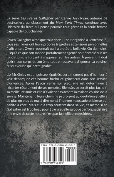 Les Frères Gallagher Tome 2 La série Les Frères Gallagher par Carrie Ann Ryan, auteure de best-sellers au classement du New York Times, continue avec l'histoire du frère qui pense pouvoir tout gérer et la seule femme capable de tout changer. Owen Gallagher aime que tout chez lui soit organisé à l'extrême. Si tous ses frères ont leurs propres tragédies et tensions personnelles à affronter, Owen reconnaît qu'il a plutôt la belle vie. Ou du moins, jusqu'à ce que son monde parfaitement agencé soit ébranlé sur ses fondations, le forçant à s'appuyer sur les autres. À présent, il doit guérir son corps et son âme tout en essayant d'ignorer sa voisine, aussi exquise qu'inatteignable. Liz McKinley est angoissée, épuisée, certainement pas d'humeur à voir débarquer cet homme barbu et grincheux dans son service d'urgences. Après l'avoir remis sur pied, elle est déterminée à l'écarter résolument de ses pensées. Bien sûr, ce serait plus facile si sa meilleure amie et elle n'avaient pas acheté la maison voisine de la sienne. Maintenant, leurs chemins se croisent au quotidien et elle a de plus en plus de mal à dire non à l'homme maussade et blessé qui habite à côté. Mais elle a trop souffert dans sa vie, et même si ce Gallagher est trop beau pour être vrai, elle sait que parfois, satisfaire une envie de cette nature n'est pas la meilleure des idées. Book 1: Un amour nouveau Book 2: Une passion nouvelle Book 3: Un nouvel espoir