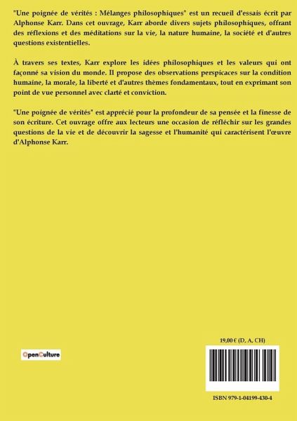 "Une poignée de vérités : Mélanges philosophiques" est un recueil d'essais écrit par Alphonse Karr. Dans cet ouvrage, Karr aborde divers sujets philosophiques, offrant des réflexions et des méditations sur la vie, la nature humaine, la société et d'autres questions existentielles. À travers ses textes, Karr explore les idées philosophiques et les valeurs qui ont façonné sa vision du monde. Il propose des observations perspicaces sur la condition humaine, la morale, la liberté et d'autres thèmes fondamentaux, tout en exprimant son point de vue personnel avec clarté et conviction. "Une poignée de vérités" est apprécié pour la profondeur de sa pensée et la finesse de son écriture. Cet ouvrage offre aux lecteurs une occasion de réfléchir sur les grandes questions de la vie et de découvrir la sagesse et l'humanité qui caractérisent l'¿uvre d'Alphonse Karr.