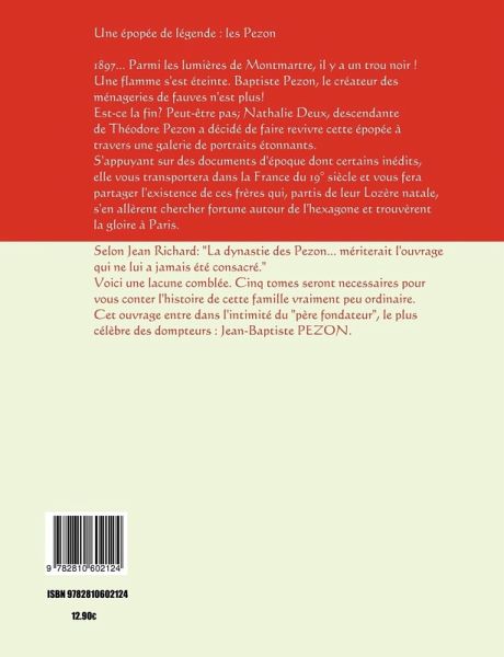 Une épopée de légende : les PEZON. 1897... Parmi les lumières de Montmartre, il y a un trou noir ! Une flamme s'est éteinte. Baptiste Pezon, créateur des ménageries de fauves n'est plus ! Une descendante de Théodore Pezon a décidé de faire revivre cette épopée à travers une galerie de portraits étonnants. D'origine lozérienne, la famille Pezon s'est illustrée dans les fêtes parisiennes pendant plus de cent ans. Véritable dynastie, elle a donné au monde circassien une quinzaine de dompteurs. Ce livre est le premier ouvrage entièrement consacré à Jean-Baptiste PEZON.