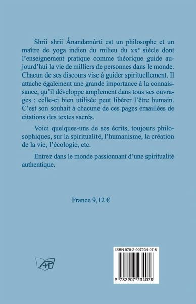 Ce florilège de textes de Shrii Shrii Anandamurti (Prabhat Ranjan Sarkar), maître spirituel et philosophe indien (1922-1990), regroupe de nombreux textes sur le sens de ce qu'est la spiritualité : que veut dire connaissance de soi, quelle est la nature du monde, où allons-nous ? etc., des écrits sur les pratiques yoguiques mais aussi sur l'avenir de l'humanisme, la psychologie, ses rapports avec la vie socio-économique et la biologie, une proposition liant la science aux limites du monde spirituel avec les microvita, des textes mêlant l'antiquité de l'Inde et spiritualité, sur l'écologie, des poèmes, une réflexion sur la pratique artistique. Il nous introduit également peu à peu, dans le monde de la philosophie du Yoga, des Vedas et des Tantras et nous fait réfléchir sur certaines des subtiles notions qui y fondent la conception philosophique de l'être humain et du monde. 178 pages, broché, 14 x 21,6 cm