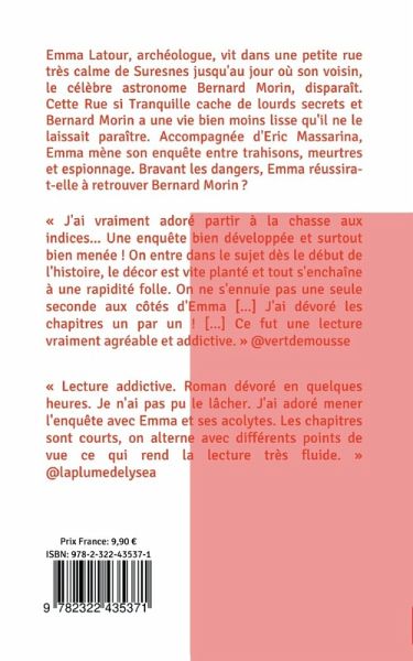 Emma Latour, archéologue, vit dans une petite rue très calme de Suresnes jusqu'au jour où son voisin, le célèbre astronome Bernard Morin, disparaît.Cette Rue si Tranquille cache de lourds secrets et Bernard Morin a une vie bien moins lisse qu'il ne le laissait paraître.Accompagnée d'Eric Massarina, Emma mène son enquête entre trahisons, meurtres et espionnage.Bravant les dangers, Emma réussira-t-elle à retrouver Bernard Morin ?