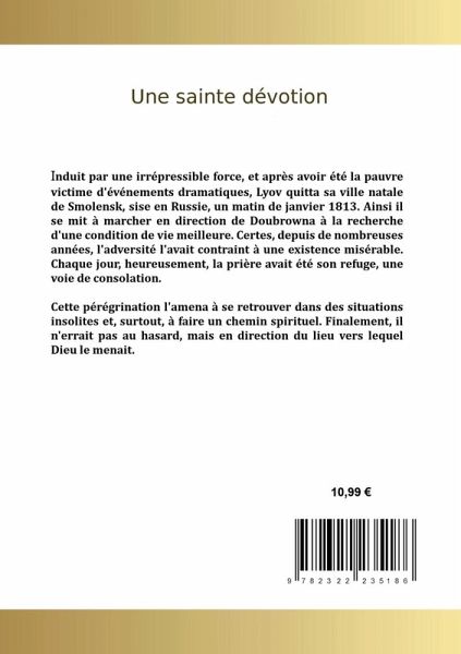 Induit par une irrépressible force, et après avoir été la pauvre victime d'événements dramatiques, Lyov quitta sa ville natale de Smolensk, sise en Russie, un matin de janvier 1813. Ainsi il se mit à marcher en direction de Doubrowna à la recherche d'une condition de vie meilleure. Certes, depuis de nombreuses années, l'adversité l'avait contraint à une existence misérable. Chaque jour, heureusement, la prière avait été son refuge, une voie de consolation.Cette pérégrination l'amena à se retrouver dans des situations insolites et, surtout, à faire un chemin spirituel. Finalement, il n'errait pas au hasard, mais en direction de ce lieu vers lequel Dieu le menait.