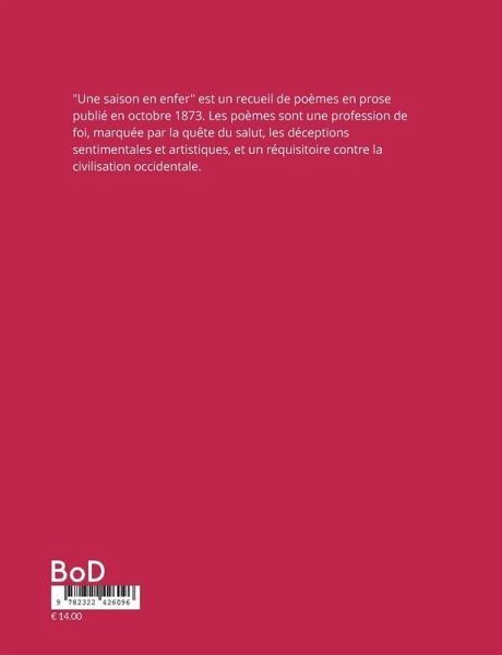 "Une saison en enfer" est un recueil de poèmes en prose publié en octobre 1873. Les poèmes sont une profession de foi, marquée par la quête du salut, les déceptions sentimentales et artistiques, et un réquisitoire contre la civilisation occidentale.Avec "Une Saison en enfer" commence le programme de démantèlement du verbe poétique français. Rimbaud écrit les poèmes d'une Saison en enfer entre le printemps et l'été 1873. Il commence le programme de démantèlement du verbe poétique français. D'autres continueront le travail initié : démembrement, dessiccation, explosion, réinvention, la rampe de lancement est la maison de maman, ferme de Roche. Il est alors rentré d'Angleterre en juillet. Nouveau voyage.ll retrouve Verlaine à Bruxelles. Leur amour est un sport de combat. Ils s'aiment, donc se déchirent. Équation banale. Verlaine lui tire dessus au pistolet. Pan, est le nom d'un dieu et le bruit d'un coup de feu. Rimbaud est blessé au poignet par la bouche à feu de Verlaine.Il revient à sa table de travail à Roche à la fin de juillet. Le recueil sera publié par un imprimeur belge en octobre. Rimbaud ira à Bruxelles chercher quelques exemplaires. Ce sera la seule fois qu'il tiendra dans ses mains une preuve imprimée de ses oeuvres.Verlaine décrira La Saison... de Rimbaud comme « une prodigieuse autobiographie psychologique »Un bilan, en somme, tiré à 19 ans d'une vie plus lourde que si elle avait mille ans.