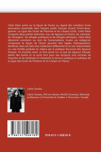 Cette thèse porte sur la figure de l'Autre au regard des membres d'une association essentielle dans l'espace public français durant l'entre-deux-guerres: La Ligue des Droits de l'Homme et du Citoyen (LDH). Cette thèse comporte deux parties distinctes: Eux, les ligueurs et l'Autre, les colonisés, les "étrangers", les réfugiés politiques et les réfugiés ethniques. Cette thèse démontre comment, au nom de l'universalisme, toutes ces catégories composant la figure de l'Autre peuvent être égales théoriquement, bénéficier dans les faits d'un traitement différentiel et se voir hiérarchisées sur une échelle graduée du mépris par la pratique discursive des ligueurs français. En d autres mots, ce livre porte sur ce que les ligueurs français disent des Autres et ce qu'ils font pour eux lorsqu'ils sont victimes de l'injustice et de l'arbitraire et réclament le secours juridique et politique de la Ligue des Droits de l'Homme et du Citoyen en France.