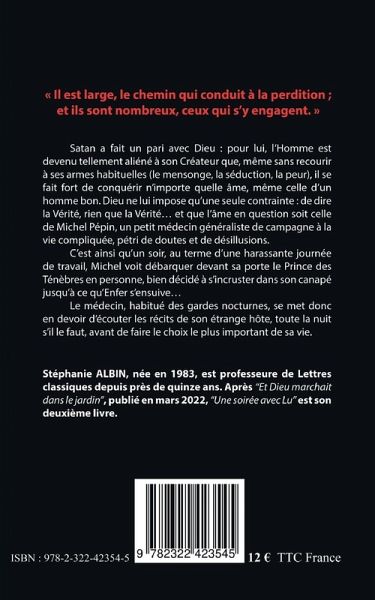 "Il est large, le chemin qui conduit à la perdition ; et ils sont nombreux, ceux qui s'y engagent."Satan a fait un pari avec Dieu : pour lui, l'Homme est devenu tellement aliéné à son Créateur que, même sans recourir à ses armes habituelles (le mensonge, la séduction, la peur), il se fait fort de conquérir n'importe quelle âme, même celle d'un homme bon. Dieu ne lui impose qu'une seule contrainte : de dire la Vérité, rien que la Vérité... et que l'âme en question soit celle de Michel Pépin, un petit médecin généraliste de campagne à la vie compliquée, pétri de doutes et de désillusions.C'est ainsi qu'un soir, au terme d'une harassante journée de travail, Michel voit débarquer devant sa porte le Prince des Ténèbres en personne, bien décidé à s'incruster dans son canapé jusqu'à ce qu'Enfer s'ensuive...Le médecin, habitué des gardes nocturnes, se met donc en devoir d'écouter les récits de son étrange hôte, toute la nuit s'il le faut, avant de faire le choix le plus important de sa vie.