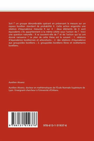 Soit un groupe dénombrable opérant en préservant la mesure sur un espace borélien standard de probabilité X. Cette action engendre une relation d'équivalence mesurée R sur X : deux éléments de X sont équivalents s'ils appartiennent à la même orbite sous l'action de . Voici une question naturelle : R se souvient-elle de et de l'action qui lui ont donné naissance ? Le plan de cette thèse est le suivant : 1. relations d'équivalence boréliennes et arboretums ; 2. des relations d'équivalence aux groupoïdes boréliens ; 3. groupoïdes boréliens libres et revêtements boréliens.