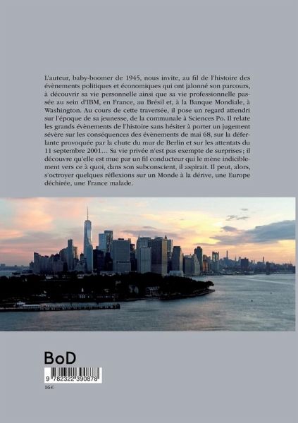 L'auteur, baby-boomer de 1945, nous invite, au fil de l'histoire des évènements politiques et économiques qui ont jalonné son parcours, à découvrir sa vie personnelle ainsi que sa vie professionnelle passée au sein d'IBM, en France, au Brésil et, à la Banque Mondiale, à Washington. Au cours de cette traversée, il pose un regard attendri sur l'époque de sa jeunesse, de la communale à Sciences Po. Il relate les grands évènements de l'histoire sans hésiter à porter un jugement sévère sur les conséquences des évènements de mai 68, sur la déferlante provoquée par la chute du mur de Berlin et sur les attentats du 11 septembre 2001... Sa vie privée n'est pas exempte de surprises ; il découvre qu'elle est mue par un fil conducteur qui le mène indiciblement vers ce à quoi, dans son subconscient, il aspirait. Il peut, alors, s'octroyer quelques réflexions sur un Monde à la dérive, une Europe déchirée, une France malade.