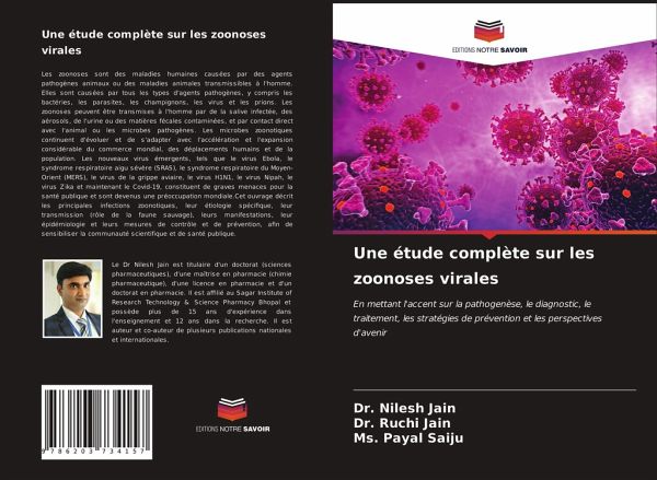 Les zoonoses sont des maladies humaines causées par des agents pathogènes animaux ou des maladies animales transmissibles à l'homme. Elles sont causées par tous les types d'agents pathogènes, y compris les bactéries, les parasites, les champignons, les virus et les prions. Les zoonoses peuvent être transmises à l'homme par de la salive infectée, des aérosols, de l'urine ou des matières fécales contaminées, et par contact direct avec l'animal ou les microbes pathogènes. Les microbes zoonotiques continuent d'évoluer et de s'adapter avec l'accélération et l'expansion considérable du commerce mondial, des déplacements humains et de la population. Les nouveaux virus émergents, tels que le virus Ebola, le syndrome respiratoire aigu sévère (SRAS), le syndrome respiratoire du Moyen-Orient (MERS), le virus de la grippe aviaire, le virus H1N1, le virus Nipah, le virus Zika et maintenant le Covid-19, constituent de graves menaces pour la santé publique et sont devenus une préoccupation mondiale.Cet ouvrage décrit les principales infections zoonotiques, leur étiologie spécifique, leur transmission (rôle de la faune sauvage), leurs manifestations, leur épidémiologie et leurs mesures de contrôle et de prévention, afin de sensibiliser la communauté scientifique et de santé publique.