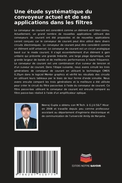 Le convoyeur de courant est considéré comme un élément actif bien connu. Actuellement, un grand nombre de nouvelles applications utilisant des convoyeurs de courant ont été proposées et de nouvelles applications seront conçues car le convoyeur de courant peut être utilisé dans divers circuits électroniques. Le convoyeur de courant peut être considéré comme un élément actif universel. Le convoyeur de courant est un circuit analogique basé sur le mode courant. Il s'agit essentiellement d'un élément à gain unitaire qui présente une grande linéarité, une large plage dynamique, une grande largeur de bande et de meilleures performances à haute fréquence. Le convoyeur de courant est une combinaison d'un suiveur de tension et d'un suiveur de courant. Dans l'étape suivante, nous avons simulé les trois générations de convoyeur de courant en utilisant la technologie CMOS 0,35µm dans le logiciel Mentor graphics et vérifié les résultats des circuits en utilisant leurs tableaux par le biais de leur forme d'onde simulée. Nous avons ensuite comparé les trois générations et la meilleure a été utilisée pour créer le circuit du filtre passe-bas à l'aide du convoyeur de courant. Ce filtre passe-bas utilisant le convoyeur de courant est ensuite comparé au filtre passe-bas réalisé à l'aide d'un amplificateur optique.