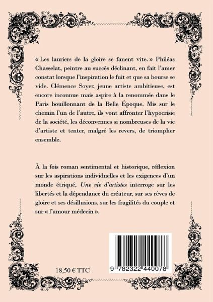 "Les Lauriers de la gloire se fanent vite." Philéas Chasselat, peintre au succès déclinant, en fait l'amer constat lorsque l'inspiration le fuit et que sa bourse se vide. Clémence Soyer, jeune artiste ambitieuse, est encore inconnue mais aspire à la renommée dans le Paris bouillonnant de la Belle Epoque. Mis sur le chemin l'un de l'autre, ils vont affronter l'hypocrisie de la société, les déconvenues si nombreuses de la vie d'artiste et tenter, malgré les revers, de triompher ensemble.A la fois roman sentimental et historique, réflexion sur les aspirations individuelles et les exigences d'un monde étriqué, Une vie d'artistes interroge sur les libertés et la dépendance du créateur, sur ses rêves de gloire et ses désillusions, sur les fragilités du couple et sur "l'amour médecin".